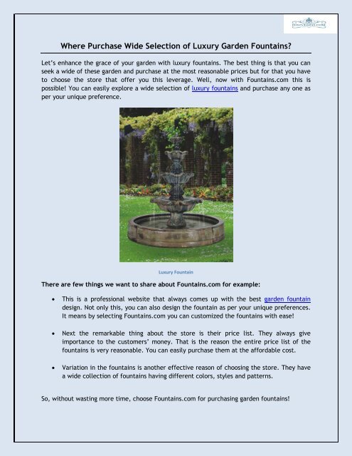 Where Purchase Wide Selection Of Luxury Garden Fountains