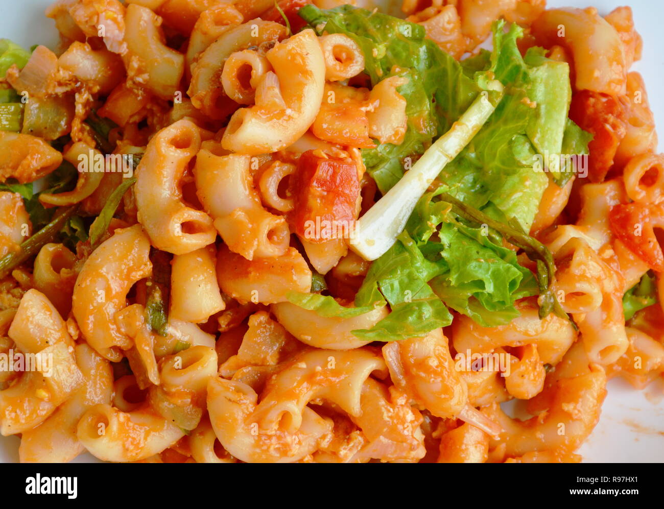 Stir Fried Macaroni With Egg And Ketchup On White Plate Stock