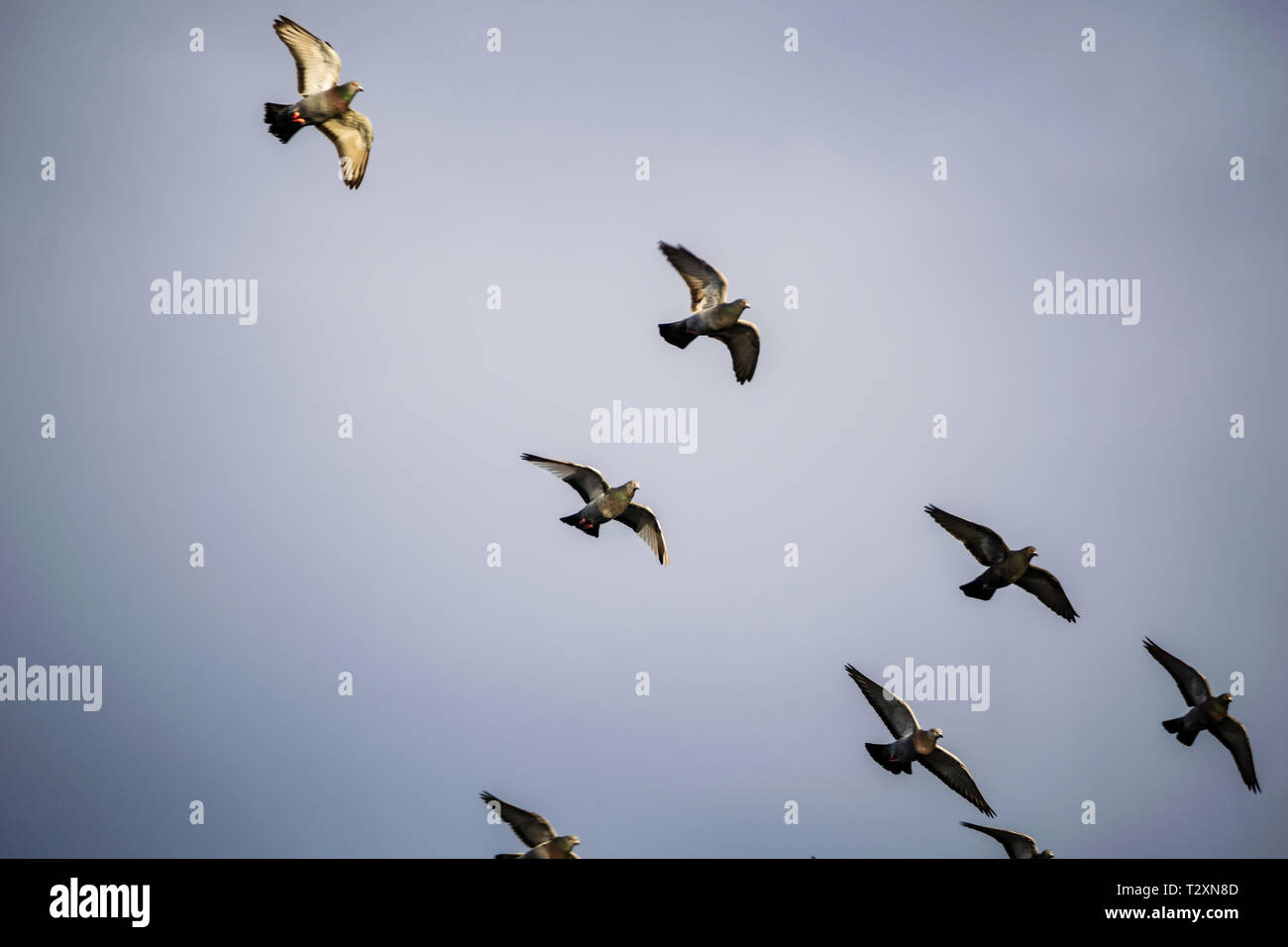 Big Flock Of Many Pigeon Birds Flying High And Hovering In Clear