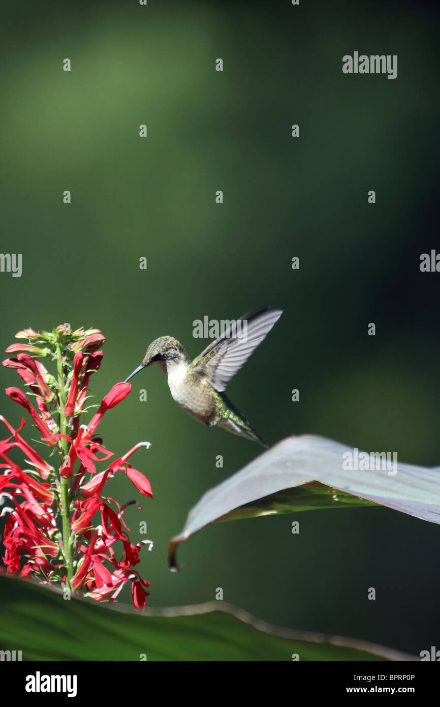 Ruby Throated Hummingbird Archilochus Colubris Hovering Near Red