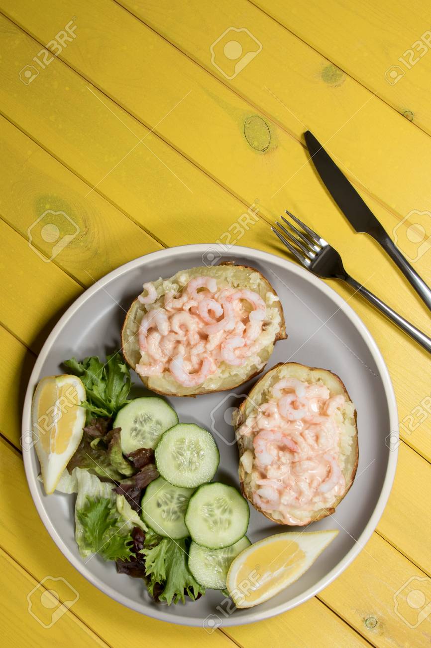 Classic Healthy Food Baked Potato With Prawn In Marie Rose Sauce