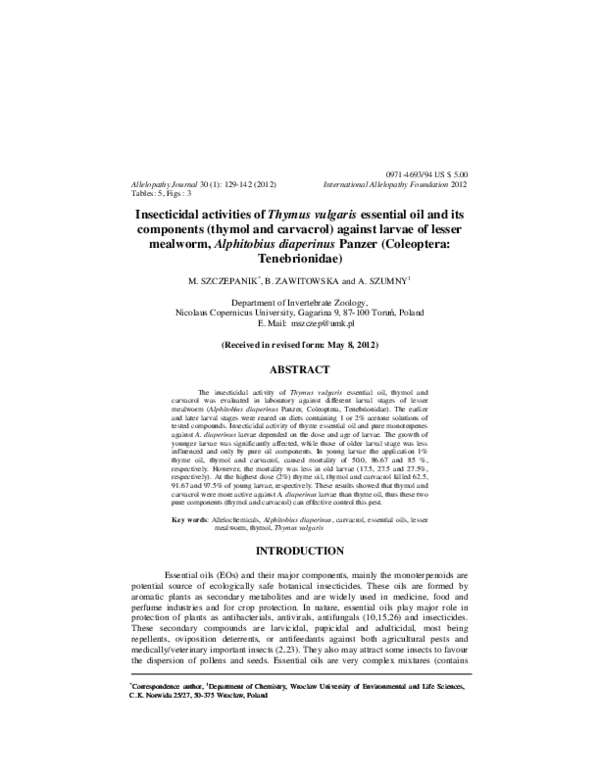 Pdf Insecticidal Activities Of Thymus Vulgaris Essential Oil And