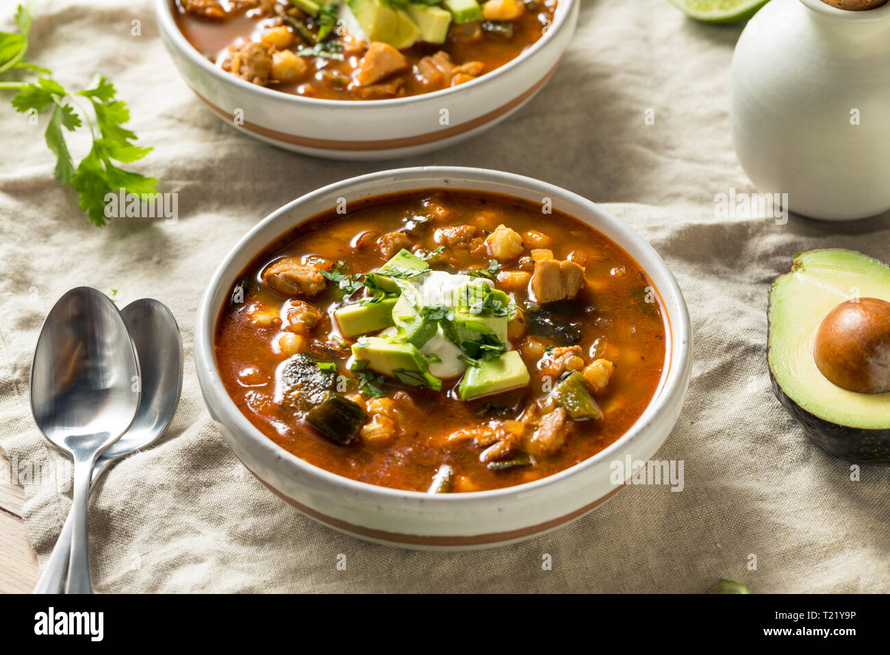 Homemade Mexican Pozole Soup With Chicken And Avocado Stock Photo