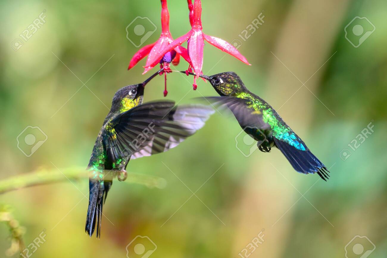 Fiery Throated Hummingbird Two Birds In Flight Feeding On Nectar