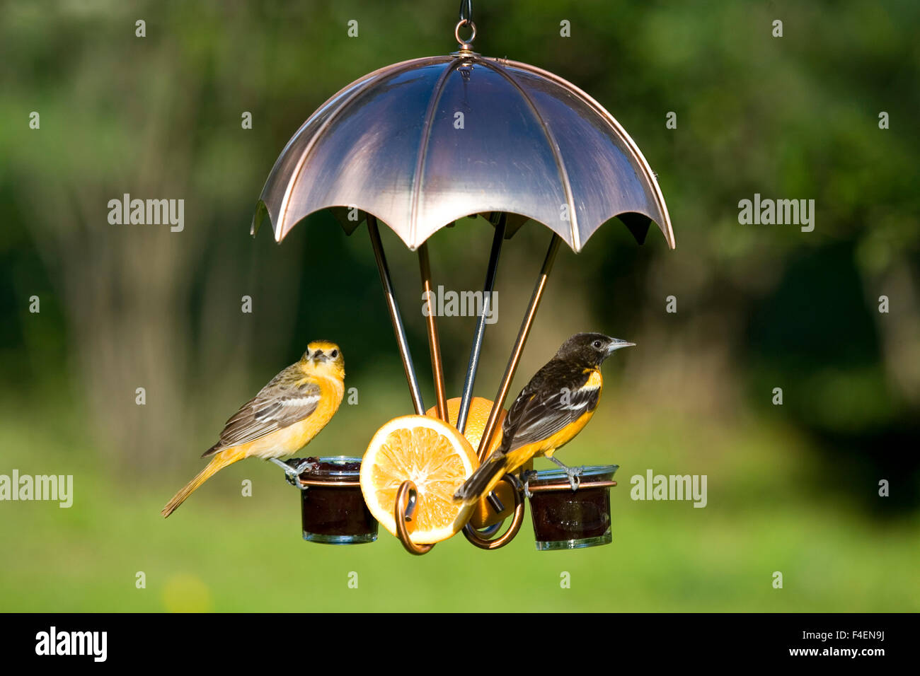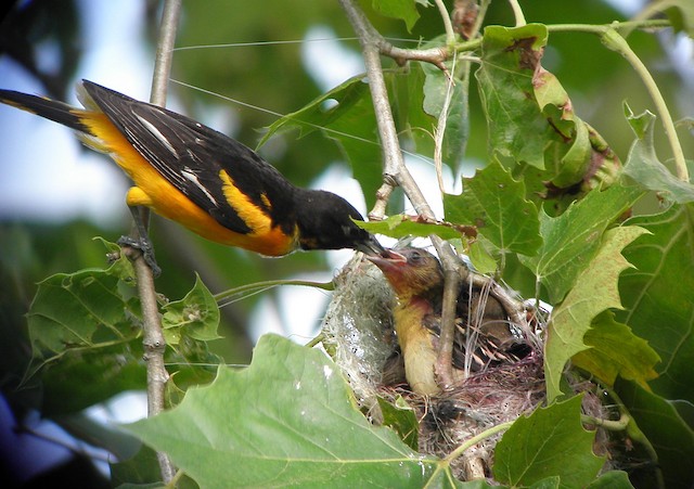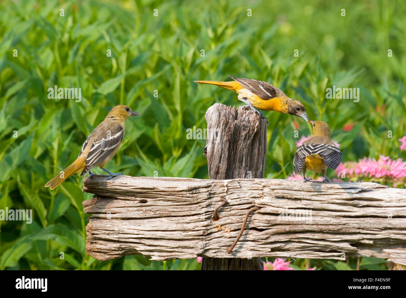 Baltimore Orioles Icterus Galbula Female Feeding Juveniles On
