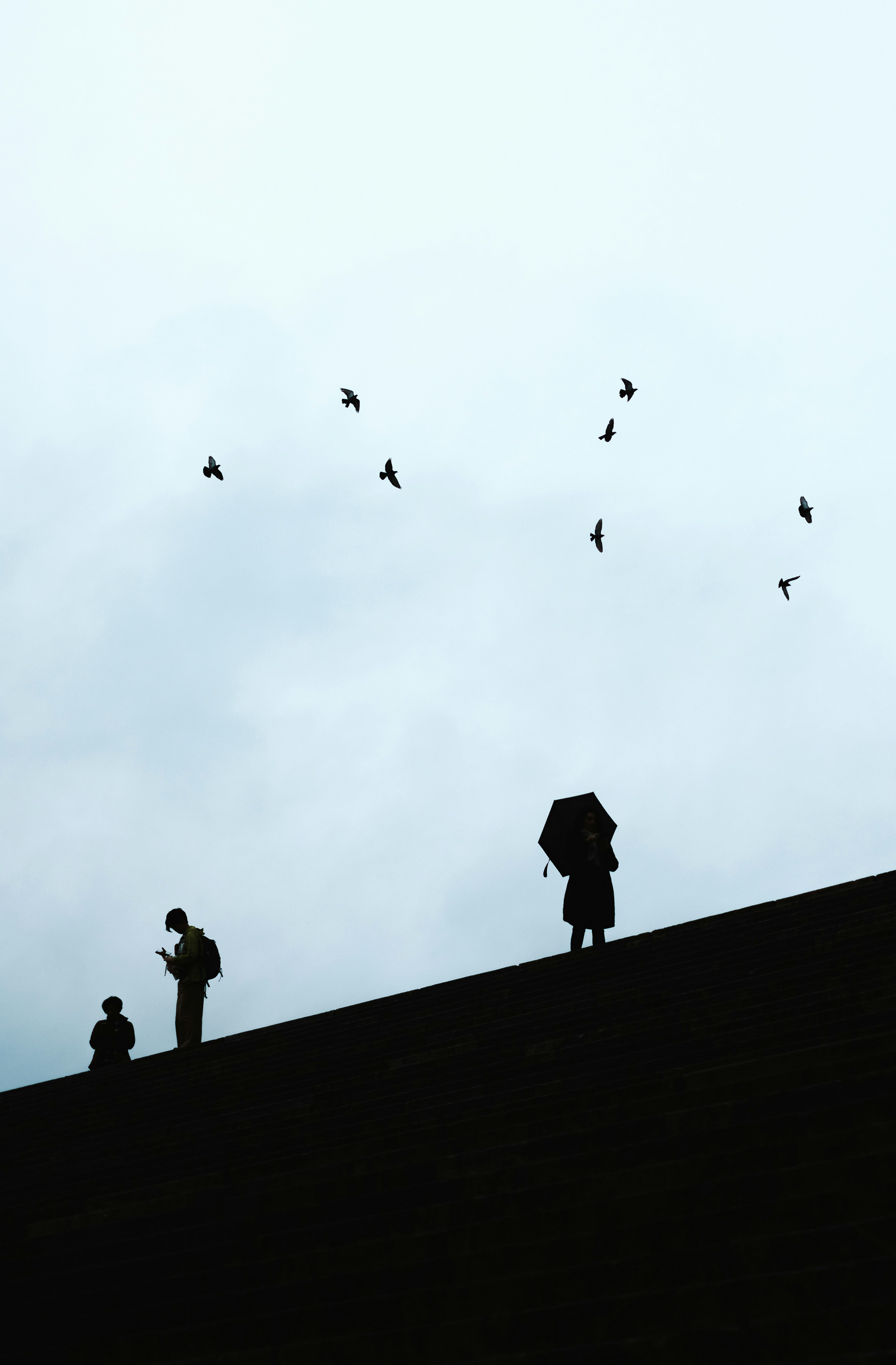 Silhouette Of People Standing And Birds Flying In The Sky Photo
