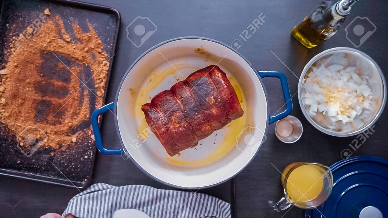Flat Lay Step By Step Cooking Boneless Pork Roast In Cast Iron