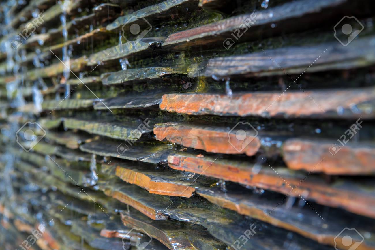 Close Up Detail Of A Natural Slate Ledge Waterfall Wall Home