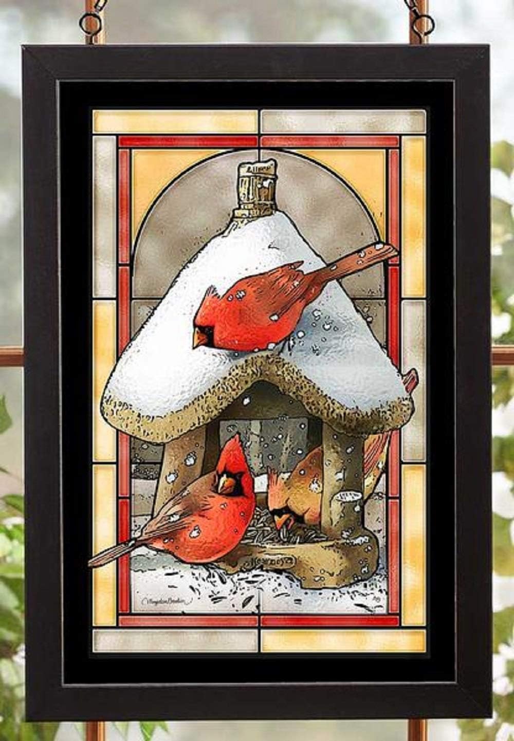 Amazon Com Cardinals Snowy Day Bird Feeder Stained Glass Art