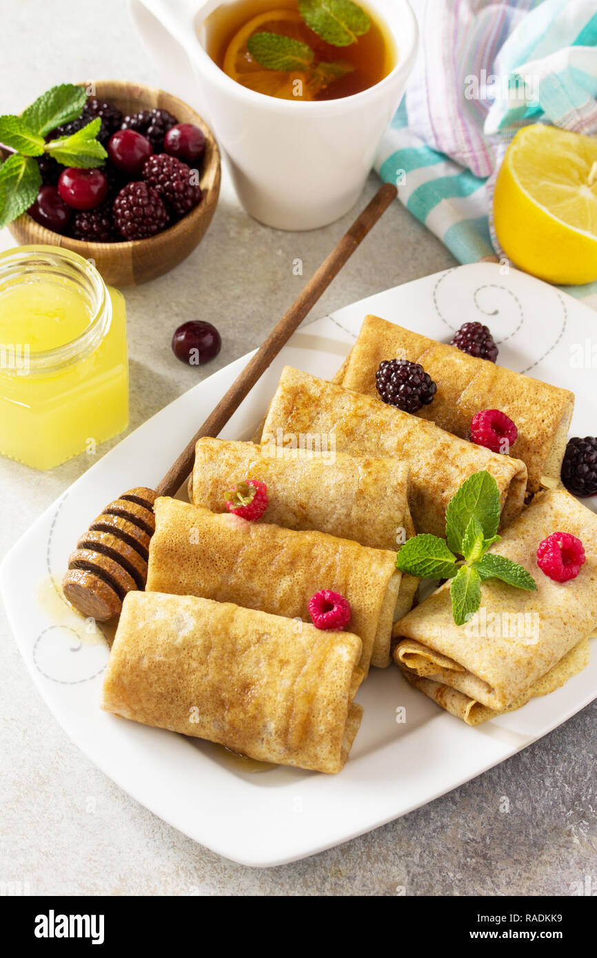 Crepes Thin Pancakes With Honey On A White Plate Close Up Stock