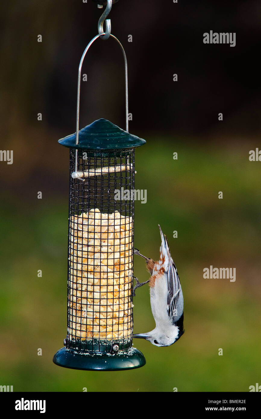 White Breasted Nuthatch Eating Upside Down On Peanut Feeder Stock