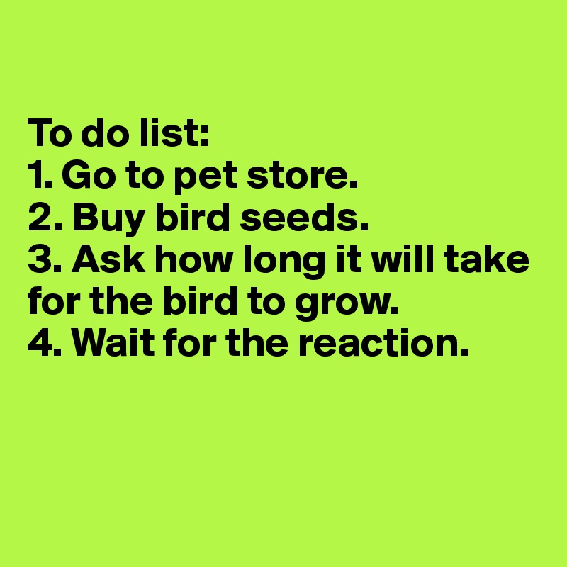 To Do List 1 Go To Pet Store 2 Buy Bird Seeds 3 Ask How Long