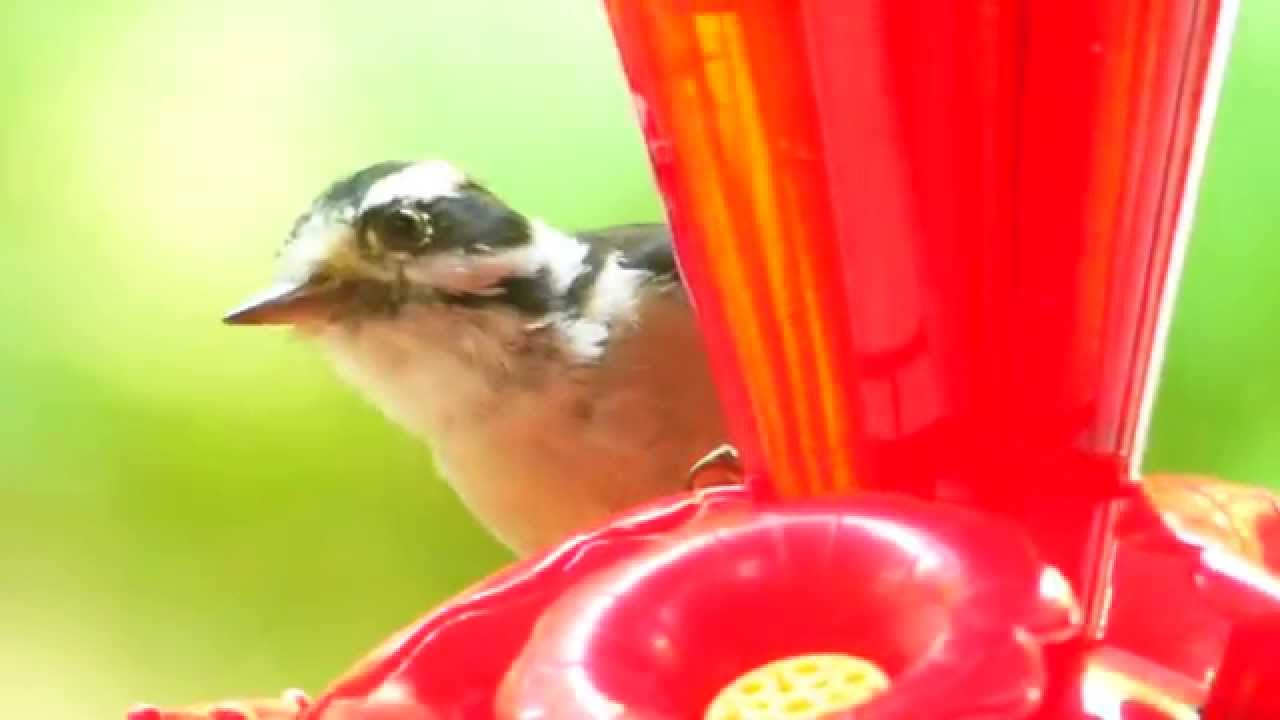 Downy Woodpecker Feeds From A Hummingbird Feeder Youtube